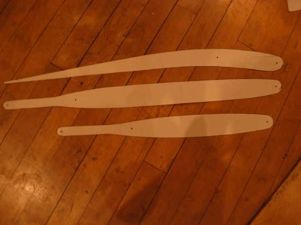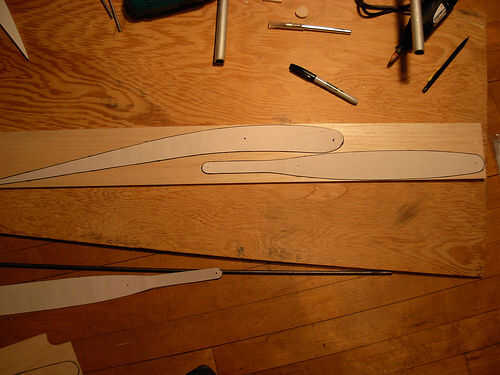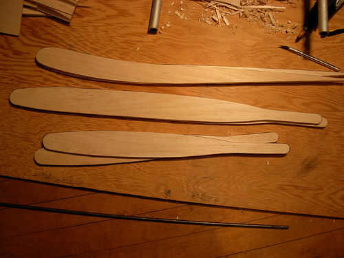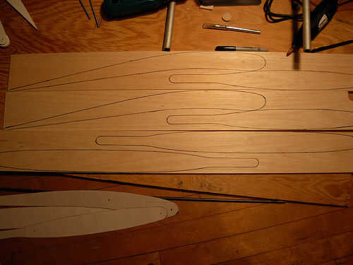 Trace los patrones sobre la balsa, dos de cada uno. Usted debe ser capaz de encajar 2 piezas por hoja de balsa si tus huesos son formados como la mía (o menor). Usando la navaja Xacto, cortar las piezas (una sierra muy pequeña y fina probablemente sería también trabajo pero mi juego sólo se rasgó para arriba mi muestra). Una buena técnica para esto es trazar las líneas varias veces, cada vez más profunda del corte. Ripcuts es muy fáciles; transversales son ligeramente más difíciles como la balsa intenta comprimir. Corte solamente un poco más cada vez. No te preocupes demasiado por la exactitud, una vez que las formas se recortan en general es fácil de tallar los bordes hacia abajo como si fueron tallando.