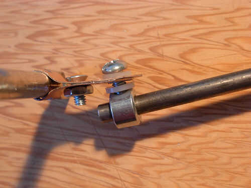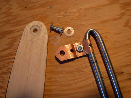 Montar la bisagra inferior del hombro utilizando un eje cuello (F), un 1/2" tornillo de máquina (H), una de las secciones de espiga de 8-3/4 de pulgada y tantas arandelas de nylon (N) según sea necesario. Ajuste la sección del pasador por el collar del eje (quitar el pequeño tornillo que viene con él). Poner el tornillo a través de la correa inferior (ambas piezas) de la parte delantera del ala hacia atrás y atorníllelo en la rosca del collar del eje hasta que el pasador se lleva a cabo en el lugar. Si hay espacio extra a lo largo de la longitud del tornillo, agregue un poco de las arandelas de nylon pequeño (P).