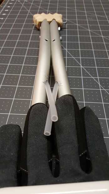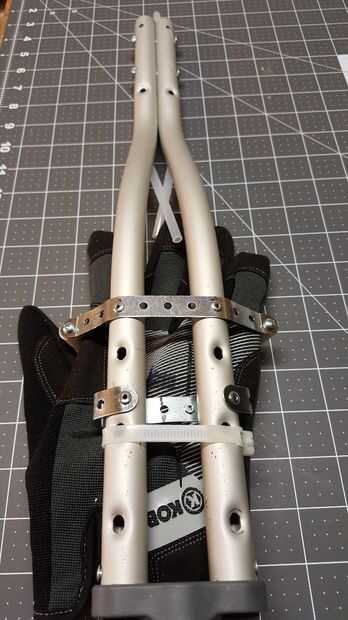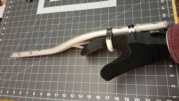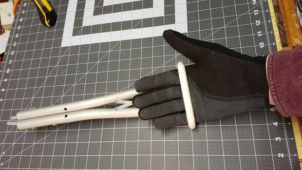 Después de desmontar las muletas de aluminio, les corté a medida aprovechando la curva existente en el tubo de modo que dos tubos se unen en el extremo de la muñeca y la curva de los tubos separados hacia el final del codo. Esto proporcionó un hueso de la muñeca relativamente estrecho que puedo pasar fácilmente las secuencias de control hacia abajo y una zona más amplia hacia el codo final para colocar el guante y la manija para manipular el brazo. Utilizando algunos 2-1/4" tornillos, perforé dos agujeros en los tubos para fijarlos juntos en la muñeca. Entonces utilicé algunas correas del sujetador del metal para crear la zona donde se coloque el guante. I taladrar orificios de 1/8" y utilizar remaches para fijar esto juntos. Yo también aprovechar la parte de plástico de las muletas para crear una pieza de extremo en el extremo de codo que posteriormente se utilizará para conectar con la parte superior del brazo.