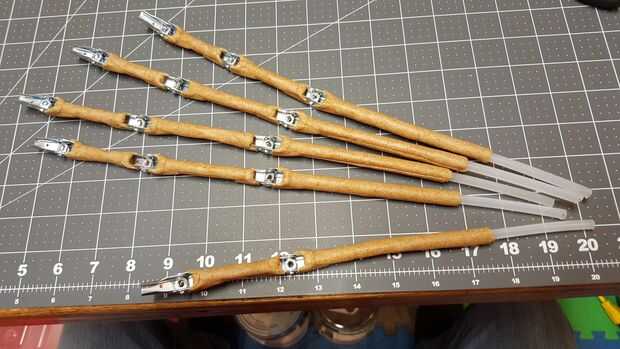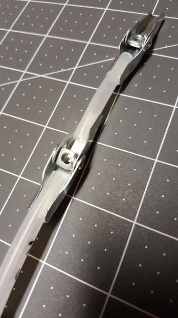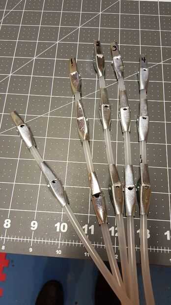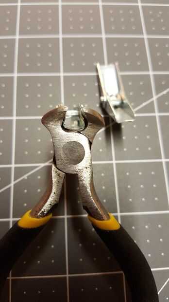 Conectar el tubo de 1/4 de pulgada para las bisagras es muy simple. Comencé con plyers regulares para rizar los extremos metálicos de la bisagra alrededor del tubo que funcionaba bien pero cuando vi mis uñas poco plyers removedor que tenía una forma semi-redonda muy bonito en el extremo de la herramienta, he encontrado que funcionan mejor para el metal termina sobre el tubo de plástico suave. Este método es muy fácil de ajustar la distancia entre cada articulación. Simplemente deslice el tubo dentro y fuera de cada articulación para ajustar. Solo necesita ser un ajuste ceñido. Más tarde, el Worbla cubre todo, sosteniendo todos juntos.