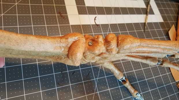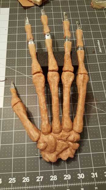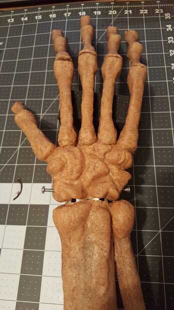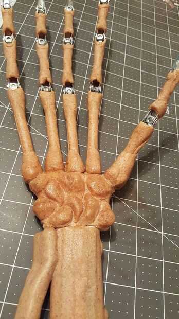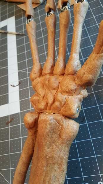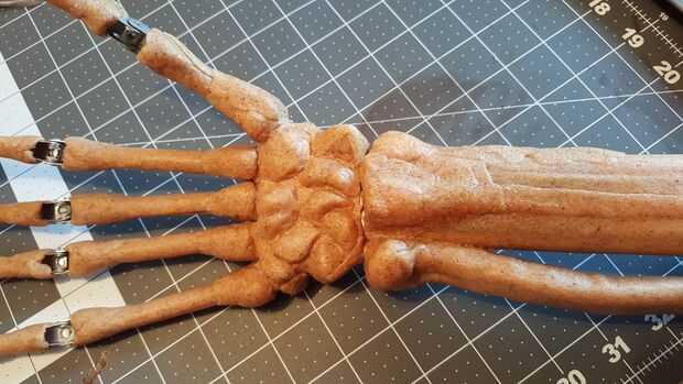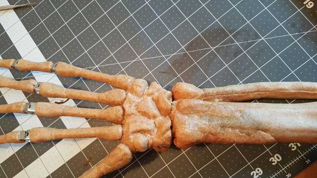 Usé varias imágenes de referencia de manos de esqueleto para formar la muñeca y los dedos. Definitivamente no es anatómicamente perfecto pero parece muy precisa. Puesto que Worbla es naturalmente pegajoso, usé un pedazo más grande para envolver la pieza de madera de muñeca para crear una buena base para el resto de la Worbla a. Crear la apariencia de hueso fue realizado por calentar trocitos y rodar en bolas o formas oblongas y pulsando luego en la posición de la muñeca mientras se mezcla en los huesos del dedo.