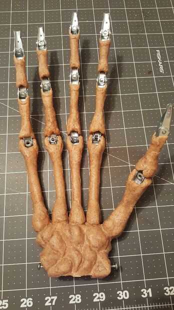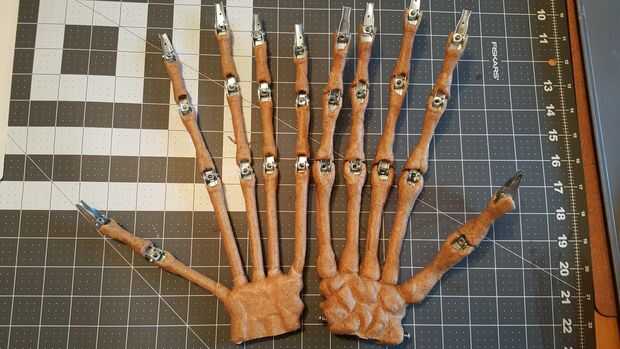 Como se mencionó anteriormente, algunos de los resortes en las uniones no eran lo suficientemente fuertes como para volver cada dedo una vez que el Worbla fue aplicado debido al peso adicional. La solución fue dividir el nudillo hacia abajo la longitud del dedo, inserte una pieza de bungee y luego doblar sobre la Worbla para fijarlo en su lugar mientras que el dedo era recto. Esta calefacción necesario Worbla en cada dedo que era complicado porque hay que asegurarse de que la Junta sigue siendo clara y no pegue cada sección del dedo. Encontré que podía colocar un pequeño trozo de papel de cera entre las juntas para evitar que el Worbla se adhiera al incrustar el bungee. Una vez seco el Worbla, el amortiguador auxiliar adicional proporciona la cantidad perfecta de la parte posterior de resorte que estaba buscando. Sólo es necesario aplicar el amortiguador auxiliar a las juntas de unos pocos, la mayoría no requieren.