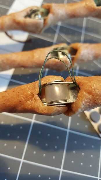Rosca cada dedo individualmente con longitudes largas de sedal trenzado de alta resistencia. Doblando el sedal, pude fácilmente lo alimentan para arriba a través de cada tubo desde la muñeca hasta la punta de los dedos. Las imágenes muestran cómo asegura cada línea a la punta del dedo.
