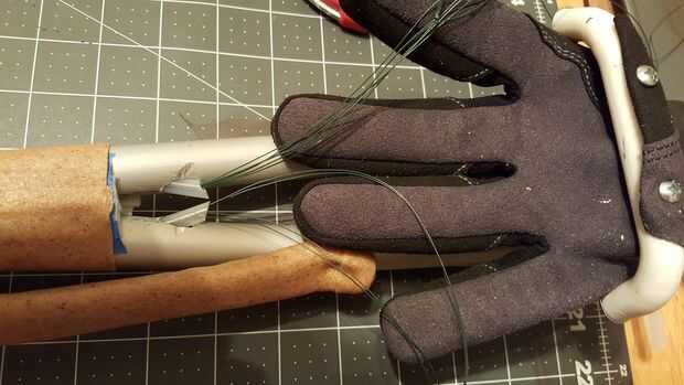 Una vez que cada dedo roscado, corrí las cadenas a través de los tubos del antebrazo hacia fuera del guante y utilizar una aguja a la línea del hilo de rosca en las puntas de los dedos del guante. Ya que no podía manipular el pulgar con el dedo, ata la línea pulgar mi tercer dedo. Sorprendentemente, con un poco de práctica, puede conseguir un movimiento natural del pulgar como cerrar el puño con el dedo tercer control.