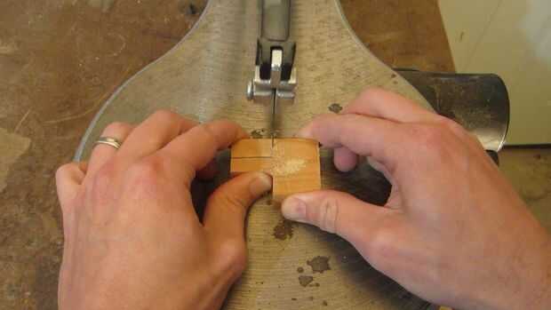 Primero marque las áreas que necesitaba hacer para que un extremo podría caber entre las placas de montaje. Dibujé dos líneas hacia abajo en el centro que fueron cerca de 3/8 de pulgada aparte. Dibujé una segunda línea de aproximadamente una pulgada del extremo que era perpendicular a las dos primeras líneas. Esto indica las dos entalladuras que necesito hacer. Entonces yo cortar utilizando una sierra de contornear.