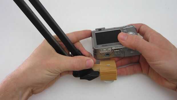 Para sujetar la cámara, colóquela sobre el soporte y alinee el orificio de montaje de la cámara con el orificio de 1/4 de pulgada en el soporte. Luego inserte un perno de 1/4-20 a través del fondo del agujero y atornille en la cámara. Esto es más fácil si utilizas otro tornillo pero un perno regular también puede funcionar.