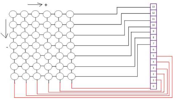 Ahora tomar todos sus LEDS y disponerlas como se muestra en la revista ilustrada a continuación. Lo círculos representan los LEDS la flecha en la parte superior representa a todos los cables positivos de los LEDS en una sola dirección, y la flecha de la izquierda representa a todos los conductores negativos de LED conectados entre sí. Los cuadros numerados púrpura representan los pines digitales en el arduino duemilanove. Deje vacío pin 6, soldar todos los cables juntos y