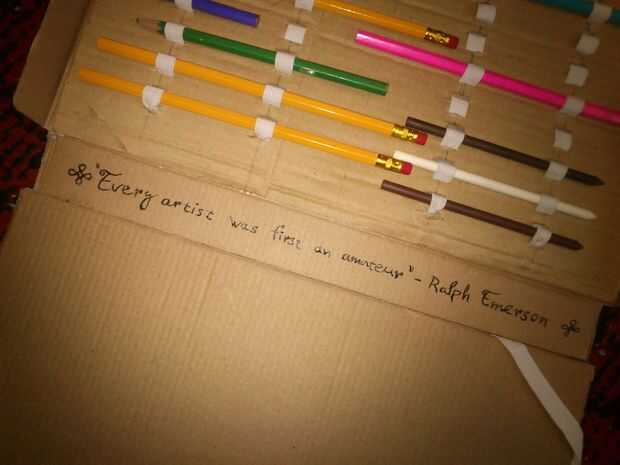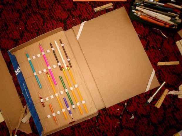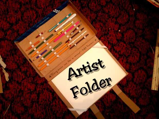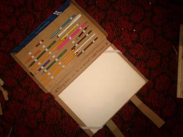 Como primer paso, elegir un cartón apropiado. Me enteré de que zapato viejo cuadro está bien, porque tiene una tapa y un tamaño de formato A4. Entonces reveló, pero seguí la tapa. Después de "cerrado" y dibujar la línea, luego cortar los lados y la forma entera. Ahora toma otra cartulina y hacer dos rectángulos mismo, que encajarían en la tapa. Uno de ellos tendrá el equipo y el segundo llevará a cabo los trabajos. Tomar la primera de ellas y diseñar algunas líneas según su equipo. Siguiente paso es hacer unos agujeros para una banda de goma que llevará a cabo los lápices. Cuando tienes, sólo poner la goma a través de la primera de ellas y hacer un nudo simple. Luego estira a través de la cartulina. Es bueno hacer "lazos de goma" con su equipo en por lo que tendrá las dimensiones deseadas. Cuando estés listo con que parte, péguelo a la tapa de la carpeta. Después de la segunda tarjeta del rectángulo y añadir algunas piezas de goma sobre el mismo. Sólo envuélvalo alrededor de la esquina y péguelo en la parte posterior. Luego pegar la pieza entera en el lado opuesto de la carpeta. Siguiente paso es añadir algún "mecanismo de cierre". He pegado sólo algunos largos trozos de cartón en la parte inferior de la carpeta y luego hizo algunas "bolsas" en la parte superior. Pero usted puede hacer lo que quiera. Yo también estaba pensando en pieza de telas y botones. O algunos cables y sólo para atarlos. Está hasta usted ;)