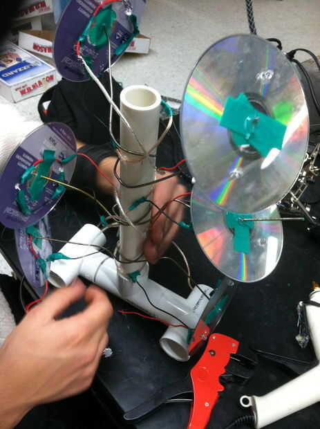 Cada conjunto se conecta luego a un CD y los LEDs se ponen a través de los agujeros. Pegamento caliente se usa para fijar los cables a la parte posterior del CD.