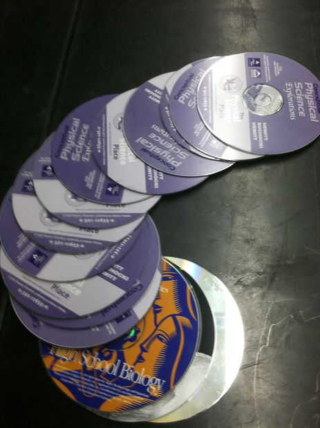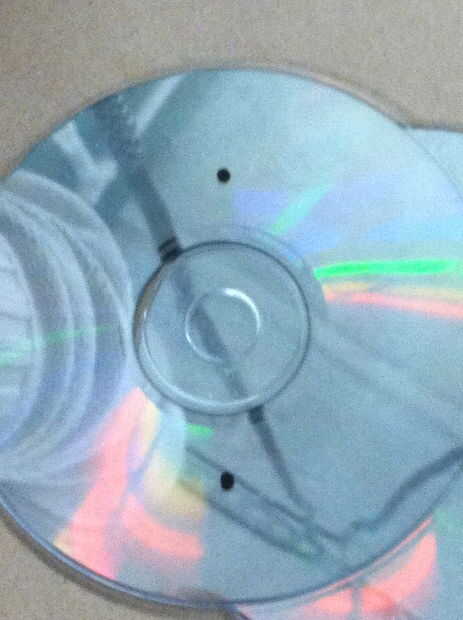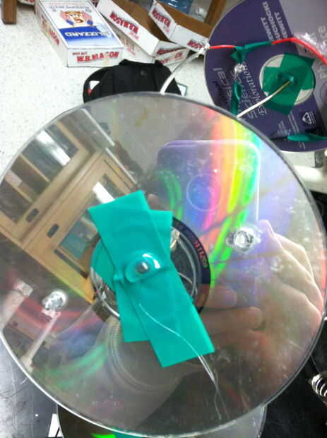 Los CDs son poner en los ganchos de alambre y pegados con cinta aislante alrededor de los orificios seguido de pegamento caliente para asegurar más lejos los CDs en su lugar.