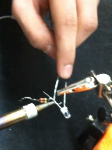 El paso siguiente es soldar los LEDs y las resistencias en sus pares. Entonces Envuelva las perchas de alambre por los orificios de la tubería y la forma en cualquier forma que desee.