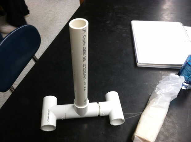 El siguiente paso después de esto es crear el soporte de la lámpara utilizando el PVC. Se utilizó una pieza de 10 pulgadas de PVC pero hará cualquier altura y esta pieza se ha quedado atascada en una Unión en t que se une luego a dos más uniones en t con pequeñas piezas de PVC. Seis agujeros se perforan luego en el soporte de altura el PVC, 3 en cada lado, a distintas alturas.