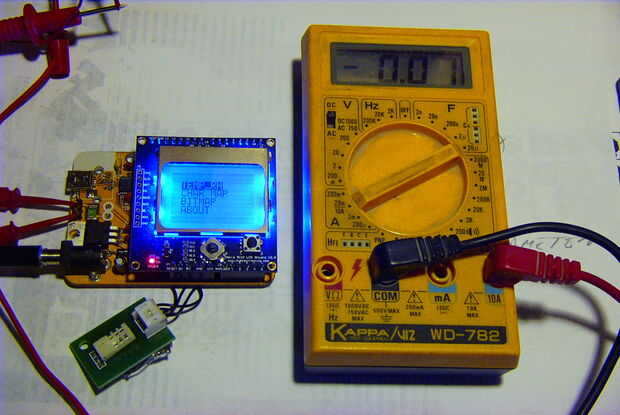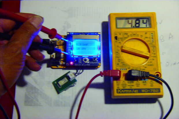 Vea la foto. Aviso el voltaje es sólo 4.84 V para el Arduino con alimentación USB (que pasa a través de un concentrador USB alimentado).