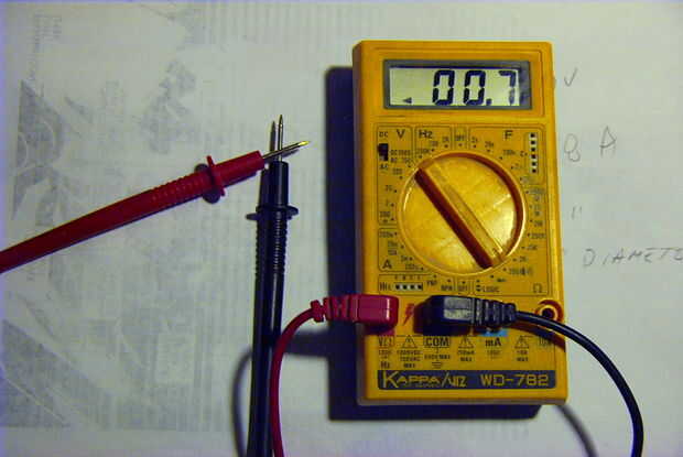 Medición de resistencia: Aviso el DMM en la foto tiene un pequeño símbolo de omega para la resistencia. Cuando se selecciona ohmios en un DMM sin nada conectado a los electrodos, se visualiza OL o mina muestra un 1 hacia la izquierda. Lo que esto significa es que es abierto (o resistencia infinita). Vea la foto. Esto es normal.