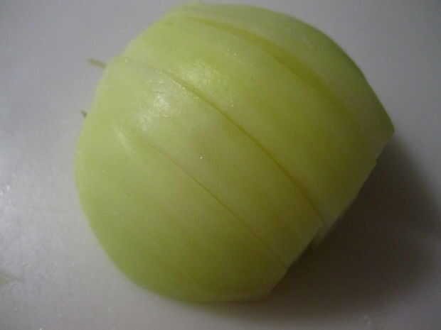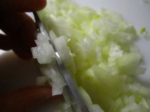 Cortar la cebolla en 1/2 a lo largo de la raíz y pelar la mitad. Corte perpendicular de la raíz, en rodajas finas, luego Pique finamente.