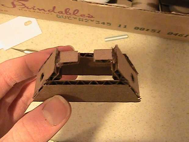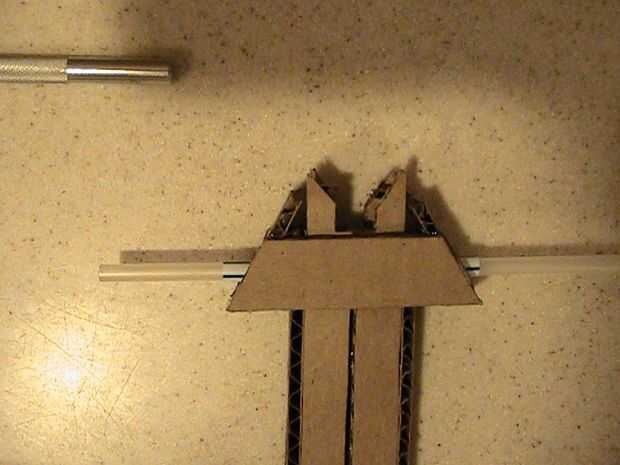 4. Inserte las patas en la pieza trapezoidal y corte los orificios a través de todo para permitir que un tubo de plástico y paja para caber a través. La paja sirve para definir el orificio y el tubo de plástico sirve como el eje. (Si no tienes tubo de plástico, usar algo más de aproximadamente el mismo tamaño).