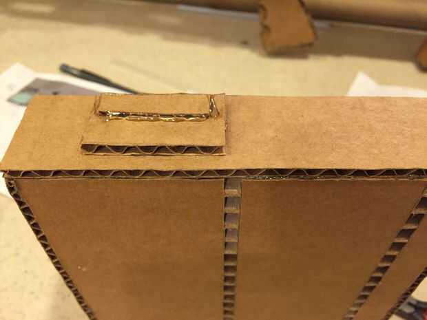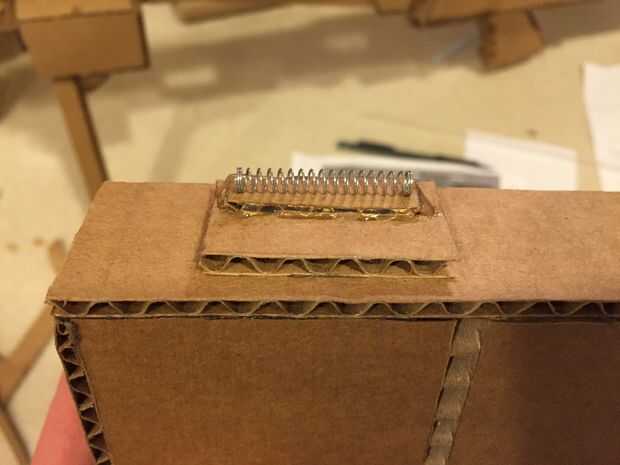 4. En la tapa de la revista, pegar un trozo de cartón con un imán integrado en su interior. Experimentar con la altura para permitir que un resorte de pluma para encajar perfectamente en el cañón cuando se inserta la revista. Cuadro 6 muestra un resorte de pluma fijo en su lugar en la revista a través de imanes.