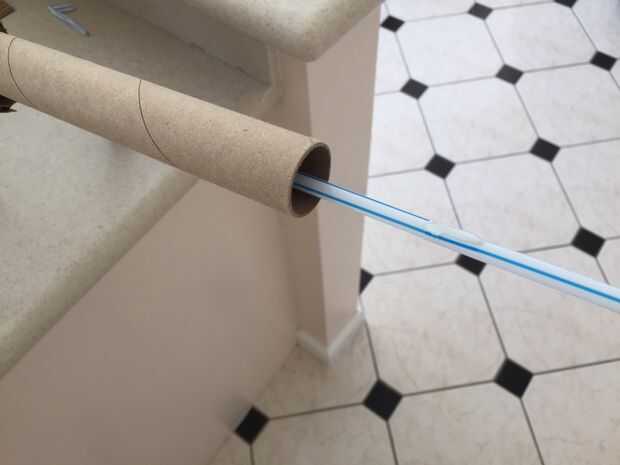 2. Comience por pegar un tubo de cartón en el extremo de la pistola. Cortar la mitad del tubo a lo largo para hacer más corto si es necesario (ver fotos uno y tres).