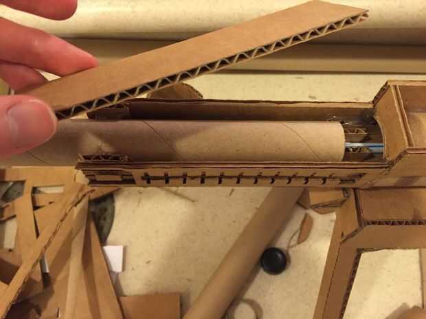 5. Extender el cañón pegado en tubos de cartón más. Cortar una tira larga de cartulina para crear una pieza de apoyo que puede pegar el cañón de la pistola de conexión con el cuerpo principal por debajo del riel (ver imagen 6).