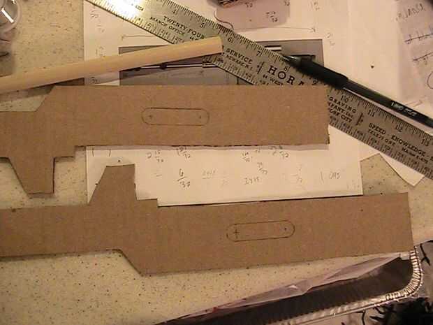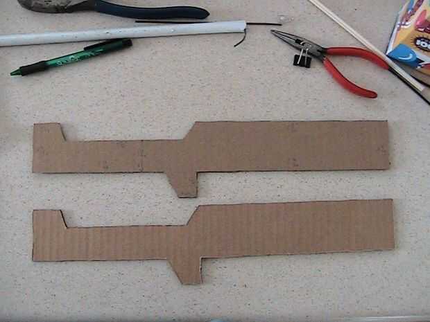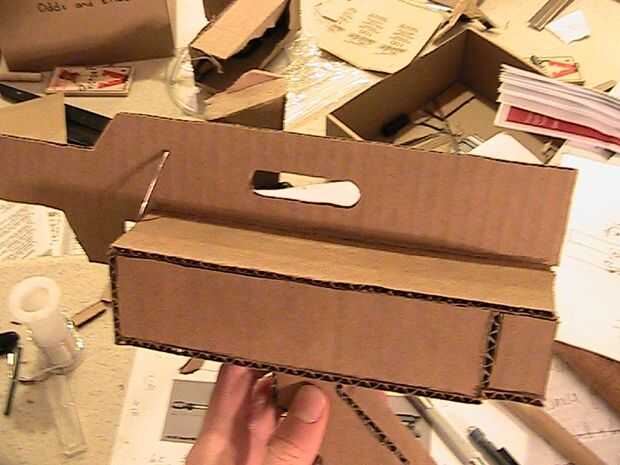 Al hacer una pistola de cartón, es útil colocar un pedazo grande de cartón que servirá como un marco en el cual se pueden construir elementos más pequeños. Para esta pistola, el marco que estoy usando es en la primera foto de arriba.