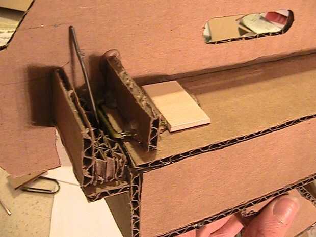 3. Ahora pega un "techo" en la unidad de vivienda y colocar otra barra de metal para tocar con él. Nota: La última barra de metal impidió el alambre que se desplaza; éste le impide avanzar. Una vez que estos estén en lugar, el cable disparador sólo puede moverse hacia arriba y hacia abajo. Esto es algo bueno. También le pegue un pedazo de cartón frente a la unidad de vivienda. (ver fotos cuarto y quinto)
