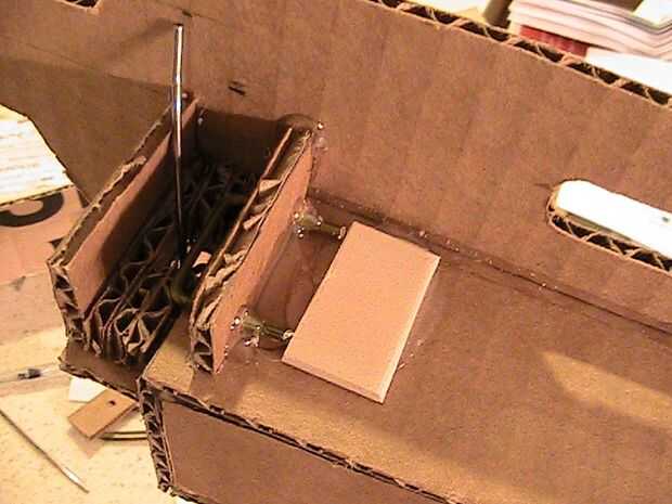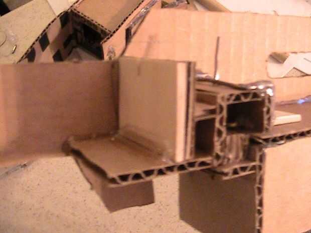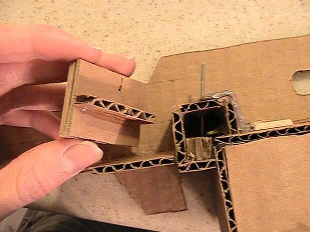 4. Por último, vamos a pegar un pedazo de cartón reforzado con una pieza de madera frente a la unidad de vivienda sobre el pedazo de cartón justo a. Corte una pequeña ranura en la parte superior. Usted verá por qué en un poco. (véase los cuadros VI y VII)