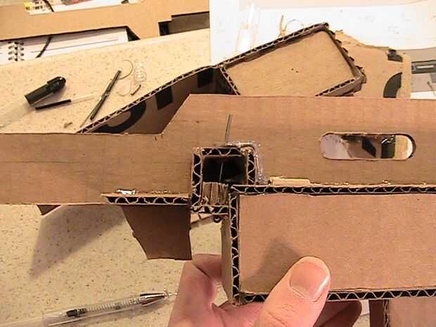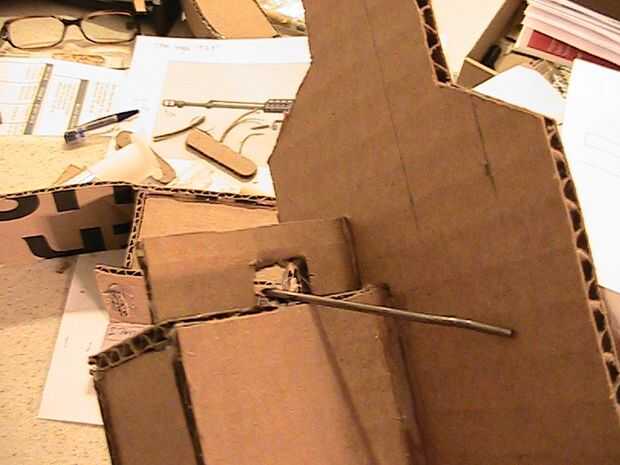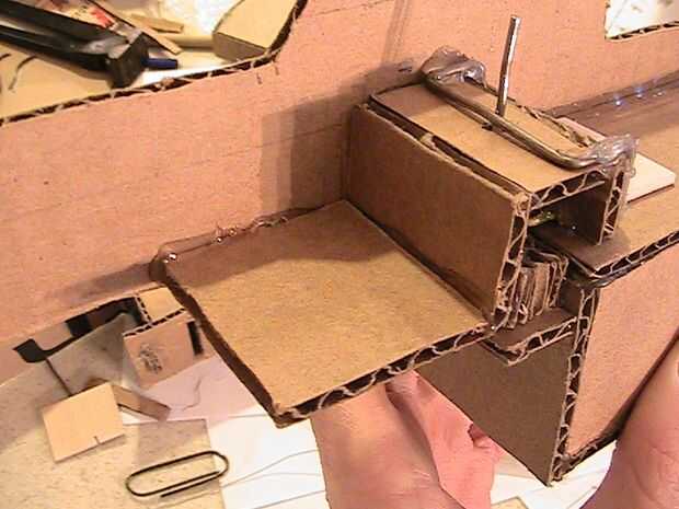 2. Encima de esta pieza, comenzar a pegar cartón para darle algunos grueso y para permitirnos pegar otra pieza en la parte superior. También pegamento un alambre (un uno grueso, corte de un hangar de la capa) con el cable disparador. (ver fotos de la segunda y terceros)