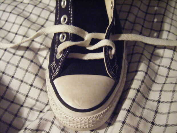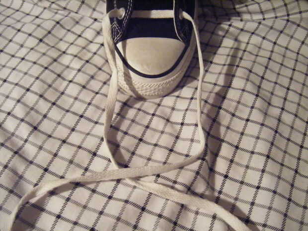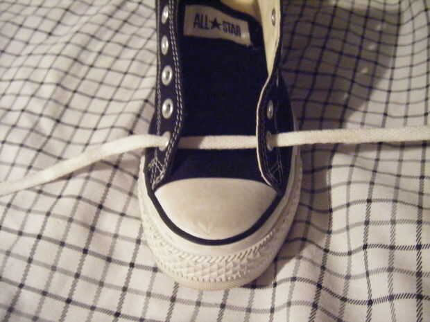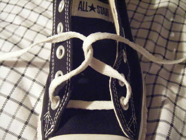 Los cordones por debajo de los ojales de la secuencia. Cruzar la cadena para hacer una X. Luego realizar otro X. puede lograrlo por torcer las cuerdas 360 grados. tomar la cadena a la izquierda y lo puso a través del orificio izquierdo. Tome la cadena a la derecha y lo puso a través del orificio derecho.