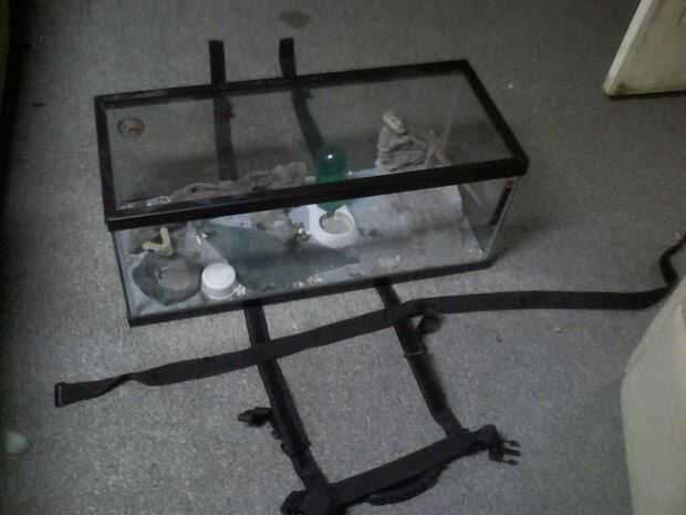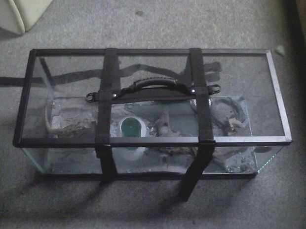 La razón que digo esto es, el vidrio del lado del acuario/terrario no fue diseñado para sostener mucha presión lo que se aplicaría por la correa. Si el acuario está lleno de posibilidades de agua son que el vidrio se rompe bajo el peso (suponiendo que usted puede levantar). Además, si intenta probar esto en un acuario de altura, también es más probable romper el vidrio.