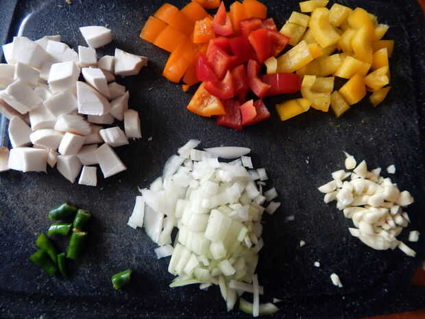 Lave todas las verduras con agua fresca del grifo y picar en trozos pequeños.