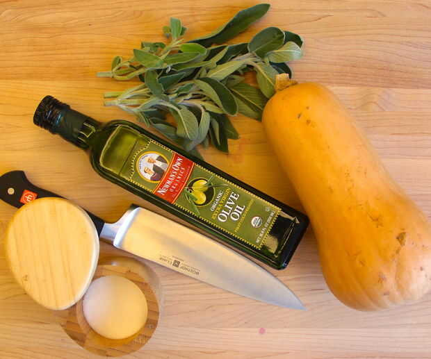 Gluten-libre tricolores raviolis con calabaza asada, garbanzos, ajo asado y cebolla caramelizada