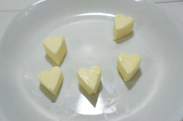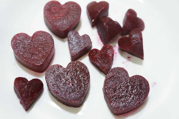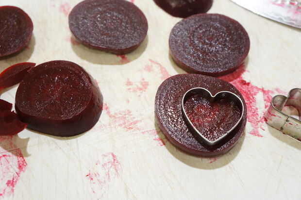 Usando el corazón en forma de cortadores de la galleta; "cortar las remolachas, las zanahorias y la mantequilla como se muestra".