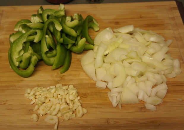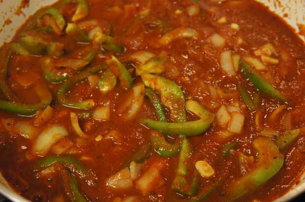 Vierta la salsa de tomate en una cacerola y calentar para arriba. Corte la cebolla, el pimiento y el ajo. Una vez que está hirviendo, agregar la cebolla y el ajo. Guardé el pimiento hasta unos 10 minutos antes de que yo estaba listo para servir. Añadir pimienta negra al gusto.