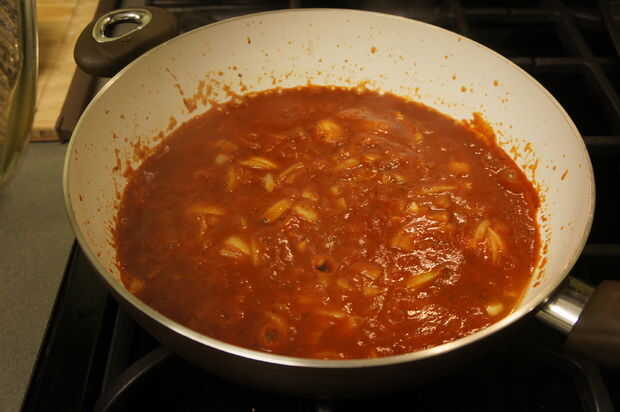 Después el spaghetti squash se hace cociendo al horno, preparar la salsa mientras se enfría.