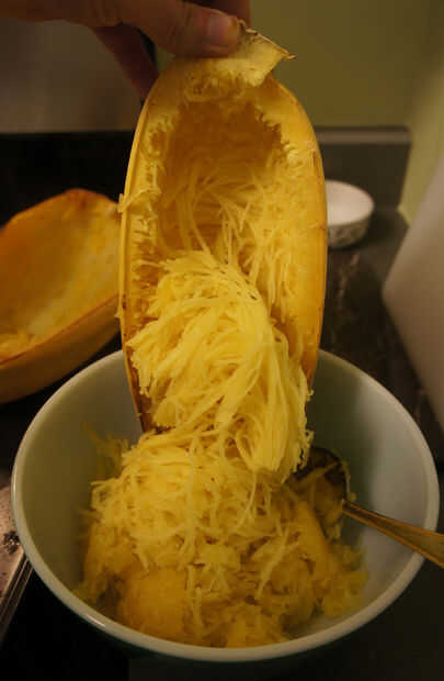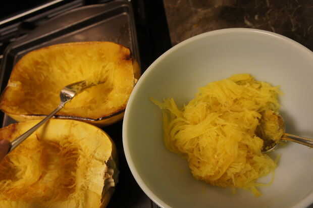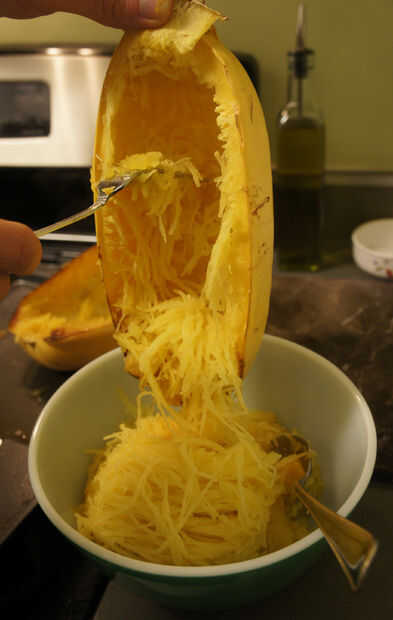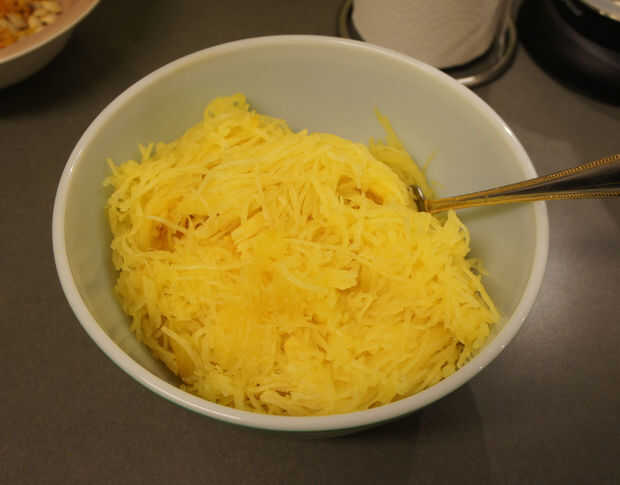 Una vez enfriada la calabaza espagueti, empezar en un extremo y un tenedor para raspar los hilos en un recipiente. Es bastante divertido cuando primero comienzas hacerlo y ver la calabaza se disuelven en un montón de cadenas. Después de todo se llama calabaza espagueti por una razón!
