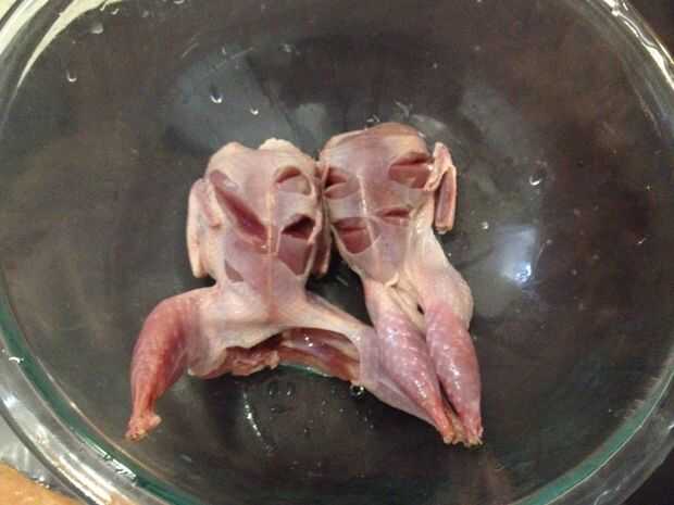 Codorniz lavar en agua fresca y fría, pat seca. Hacer un corte en ambos lados del pecho.