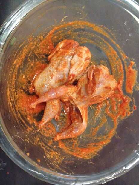 Tome el tazón grande, agregue todos los ingredientes con codorniz y mezclar bien hasta codornices cubren muy bien con las especias.