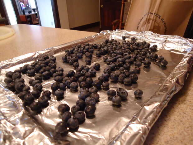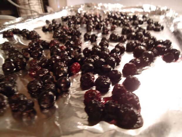 Se extienden las bayas en una hoja de galleta. (Hoja un poco ayuda a limpiar vaya más rápido) Asar las bayas durante 10 minutos a 350 o hasta que oscurecen y comienzan a pop.