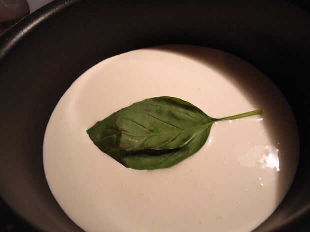 La receta para esto deba escarpada 5 hojas de albahaca grandes en 8oz de crema de leche y a fuego lento y revolver, a fuego lento y revolver, poco calefacción suficiente para extraer aceites de la hoja y bla bla bla deja que se enfríe y látigo.