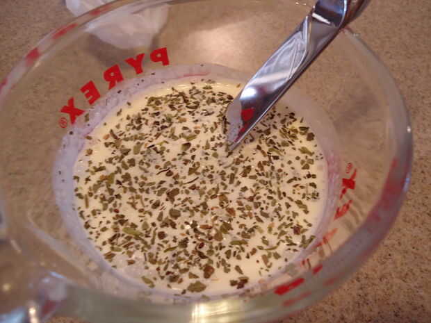 Añadir la albahaca secos a la crema espesa y el frío en la nevera durante 30 minutos. (O a fuego lento y revolver y enfriar)