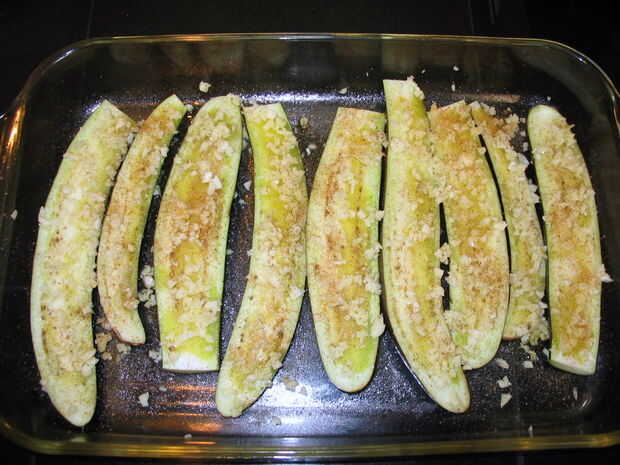 Espolvorear el ajo picado sobre la berenjena a tu recomendado: densidad, luego rociar la berenjena con un poco de aceite de oliva.