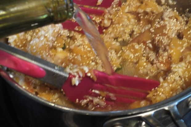 Cuando el vino se haya evaporado agregar caldo 1 taza a la vez hasta que los granos absorben el líquido.