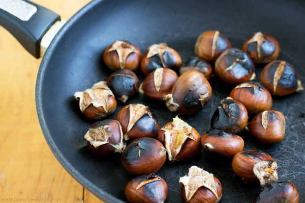 Lavar las castañas y los seca, toque. Con un cuchillo, cortar una X en cada castaña (Asegúrese de que usted corte a través de la cáscara dura). Colocar en una sartén de hierro fundido, cubierta con una tapa y asado sobre medio a temperatura alta durante 10 minutos (gusto uno y apagar el calor cuando esté listo). Revolver de vez en cuando.