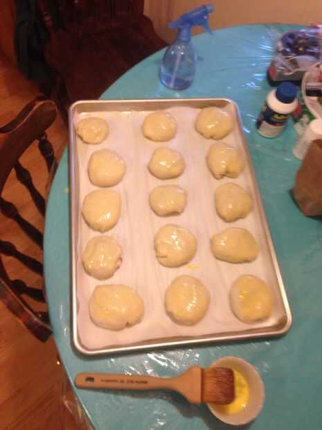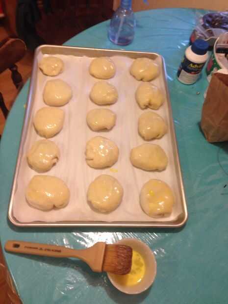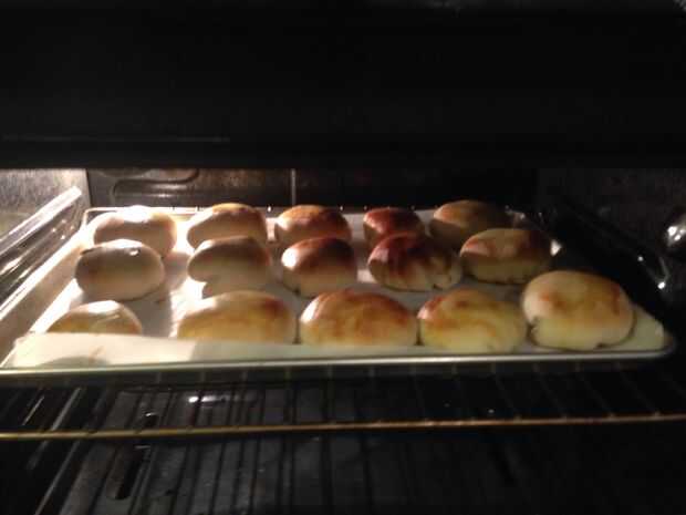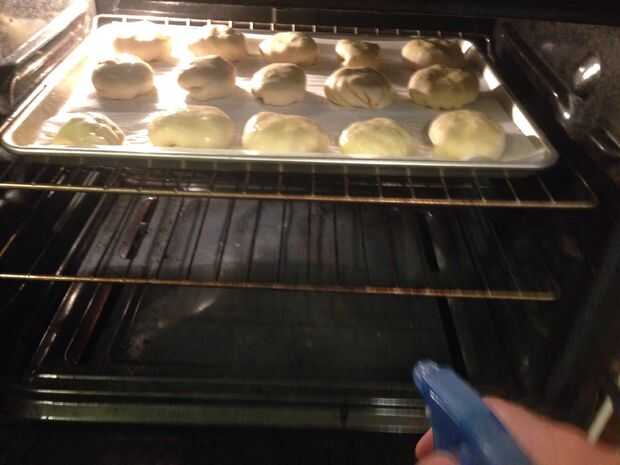 Calentar el horno a 375F y tomar un huevo y agregar una cantidad igual de agua a la misma. Use una brocha de cocina para cubrir la parte superior de cada pan. Les cuece al horno durante 15 minutos o hasta que estén doradas. Ayuda a rociarlas suavemente con un poco de agua y gire la charola durante la cocción.