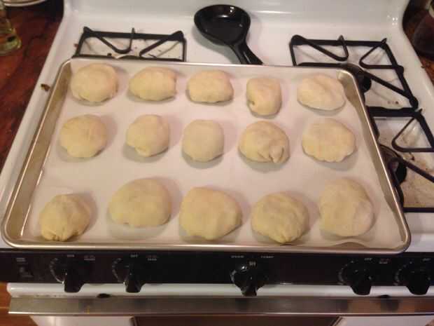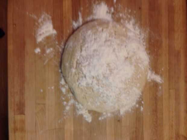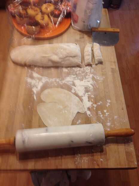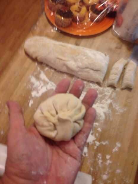 Amasar la masa un par de veces y el rodillo en forma de cilindro o pan sobre un pie y medio de largo y 2" a 3" de ancho. Cortar en trozos del tamaño de balonmano.