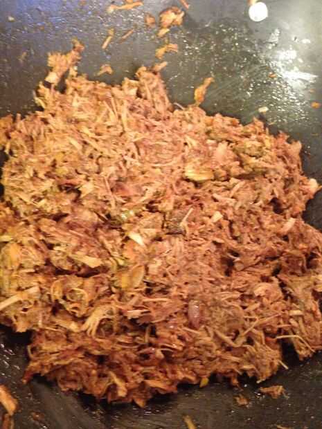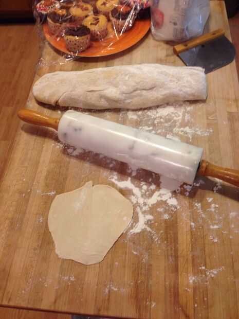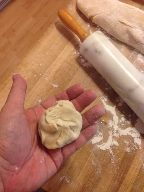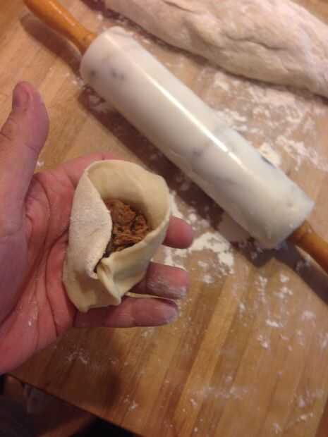 Tomar un trozo y estirar a una ronda de 5 a 6. Hacer un pozo en el centro con los dedos. Añadir una cucharada colmada o dos llenas de la mezcla al pozo.