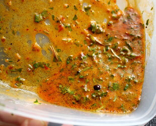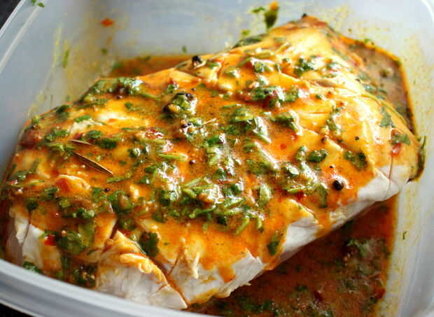 Mezcla de la marinada. Cortar cuadrados de la capa de grasa de la carne y adobo, adobo en los cortes de cepillado. Dejar durante la noche o al menos durante 4 horas.