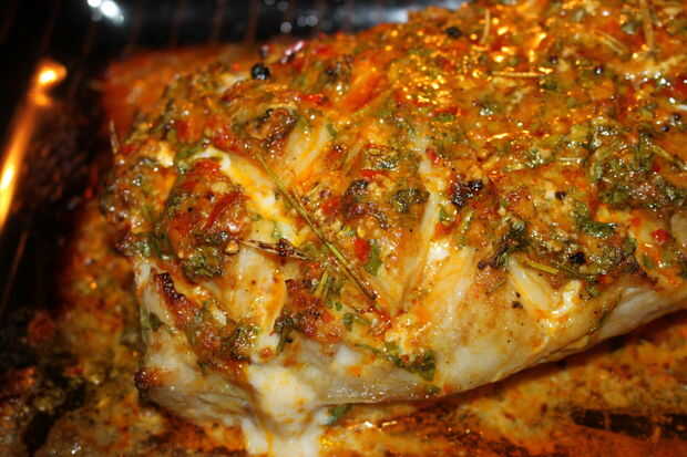 Asar en el horno a 200 C por 1.5 horas. Las hierbas se dará una corteza maravillosa.
