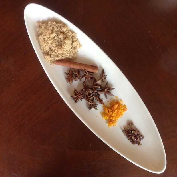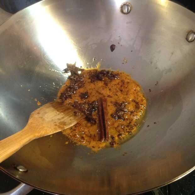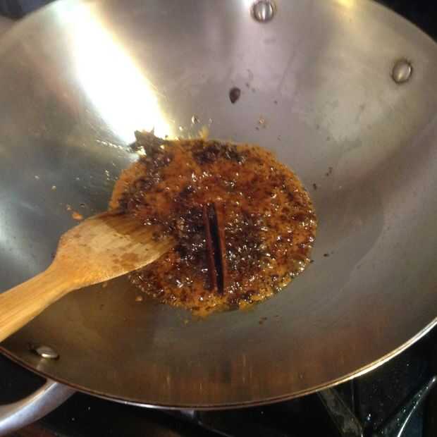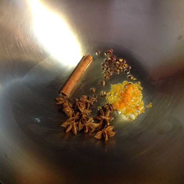 Colocar 1 cucharada de aceite vegetal, granos de pimienta de Sichuan una docena, varios anís estrellado chino, 1 rama de canela, ralladura de naranja 1 cucharadita, 2 cucharadas de azúcar morena en sartén wok a fuego medio.