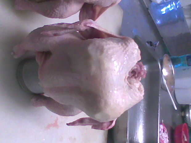 Levantar pollos de manera que el cuello quede en posición vertical y fuerza al otro lado sobre la lata para que está parado